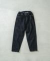 100%のデニムの風合いを残しながら微ストレッチが入った特別なデニム。ムラ色を使用することでヴィンテージ感のある表情に仕上がっています。また通常よりもインディゴ染色を深くすることで、色の濃淡がつきやすく経年変化もより楽しめます。レーザーと手擦りを組み合わせたリアルな手法で中古感を出しました。ワンウォッシュは素材そのもののナチュラルな風合いをよく現しています。