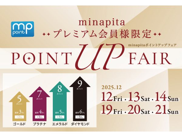 なんばパークス店にてミナピタプレミアム会員様限定minapitaポイントアップフェアを開催します。【催事期間】12月12日(金)~12月14日(日)12月19日(金)~12月21日(日) (計6日間)【内容】全プレミアム会員を対象に、なんばパークス・なんばCITYの各店にて1会計¥30,000(税込)以上の利用で、当該お買い上げに対してゴールド会員は「通常ポイント + 2ポイント」を進呈。プラチナ・エメラルド・ダイヤモンド会員は「通常ポイント + 3ポイント」を進呈。例:ダイヤモンド会員の場合、通常6ポイント + 3ポイント → 110円(税込)につき9ポイント進呈。https://nambaparks.com/event/273